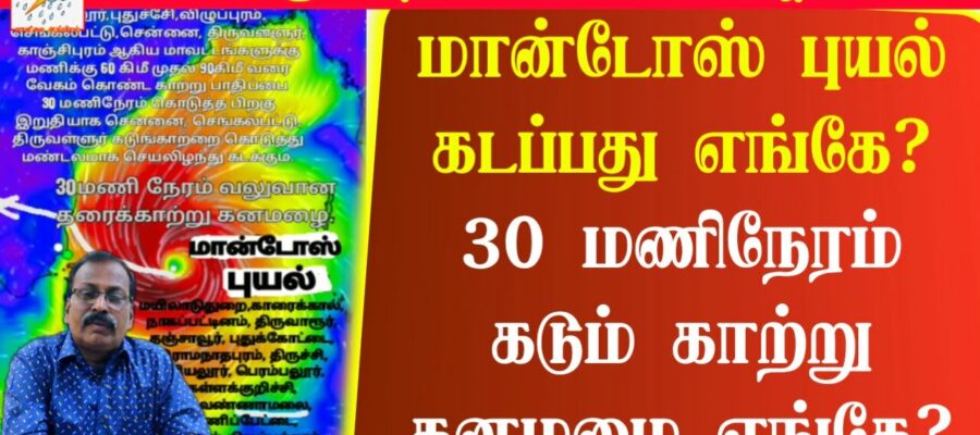 மான்டோஸ் புயல் அதிகாலை நிலவர ஆய்வறிக்கை: மான்டோஸ் புயலானது கரை நெருங்கி செயலிழந்து கடக்கும் இடமாகிய கடலூருக்கும் சென்னைக்கும் இடைப்பட்ட மாமல்லபுரம் மரக்காணம் பகுதிக்கு தென் கிழக்கே 500 கிலோமீட்டர் தொலைவில் மையம் கொண்டுள்ளது. இது மேற்கு பிறகு மேற்கு வட மேற்கு திசையில் நகர்ந்து வடகடலோரத்தை நெருங்கும். காரணமாக டெல்டா மாவட்டங்கள் முதல் வட கடலோர மாவட்டங்கள் வரை இன்று காலை மழை தொடங்கும் .மதியத்திற்குள் கடலோர மாவட்டங்களின் உள்பகுதிக்கும் மழை தொடங்கும்..மாலையில் இருந்து தரைக்காற்றுடன் மழை பொழிவு இருக்கும். வட கடலோர மாவட்டங்களில் டிசம்பர் 10 காலை வரை காற்றுடன் மழை இருக்கும். டெல்டா மாவட்டங்களில் டிசம்பர் 9 இரவு வரை மழை இருக்கும். காற்றைப் பொருத்தவரை தடைக்காற்று டெல்டா மாவட்டங்களில் மணிக்கு 45 கிலோமீட்டர் வேகம் முதல் 65 கிலோ மீட்டர் வேகம் வரை விட்டு விட்டு சாரல் மழையுடன் இருக்கும். டெல்டா மாவட்டங்களின் கடலோர பகுதிகளில் தொடர்ச்சியான காற்று 55 கிமீ 60 கிமீ வரைக்கும் விட்டுவிட்டு இருந்து கொண்டே இருக்கும். கடலூர் முதல் திருவள்ளூர் வரை உள்ள வட கடலோர மாவட்டங்களில் சுமார் 30 மணி நேரங்களுக்கு குறையாத காற்று விட்டு 60 கி மீ இருந்து 75 கிலோமீட்டர் வரைக்கும் இருக்கும். அவ்வப்பொழுது அது 90 கிலோமீட்டர் வரைக்கும் கடலோரப் பகுதியில் எட்டும். உள்பகுதியிலும் 65- 75கிமீக்கு குறையாத காற்று வடகடலோர மாவட்டங்களின் உள்பகுதியிலும் இருக்கும். இது டிசம்பர் 10 அதிகாலை அல்லது காலை செயலிழந்து தாழ்வு மண்டலமாக பிறகு தாழ்வு பகுதியாக உள் மாவட்டங்கள் வழி அரபிக்கடல் நகரும். இதனால் உள் மாவட்டங்களில் மழை பொழிவு கொடுக்கும். தொடர்ந்து வங்கக்கடல் காற்று ஈர்த்து டிசம்பர் 13 வரை ஆங்காங்கே நல்ல மழை கொடுக்கும். மான் டோஸ் புயல் நீடித்து நின்று தரைக்காற்றை ஈர்க்கும் என்பதால் இரண்டு நாட்கள் வட கடலோர மாவட்டங்கள் இயல்பு வாழ்க்கை முடங்கும்.